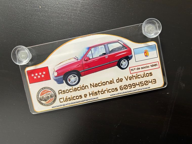 Una placa de metacrilato personalizada con la foto de tu vehículo con la bandera de tu comunidad autónoma, tu ciudad y tu numero de socio en la asociación